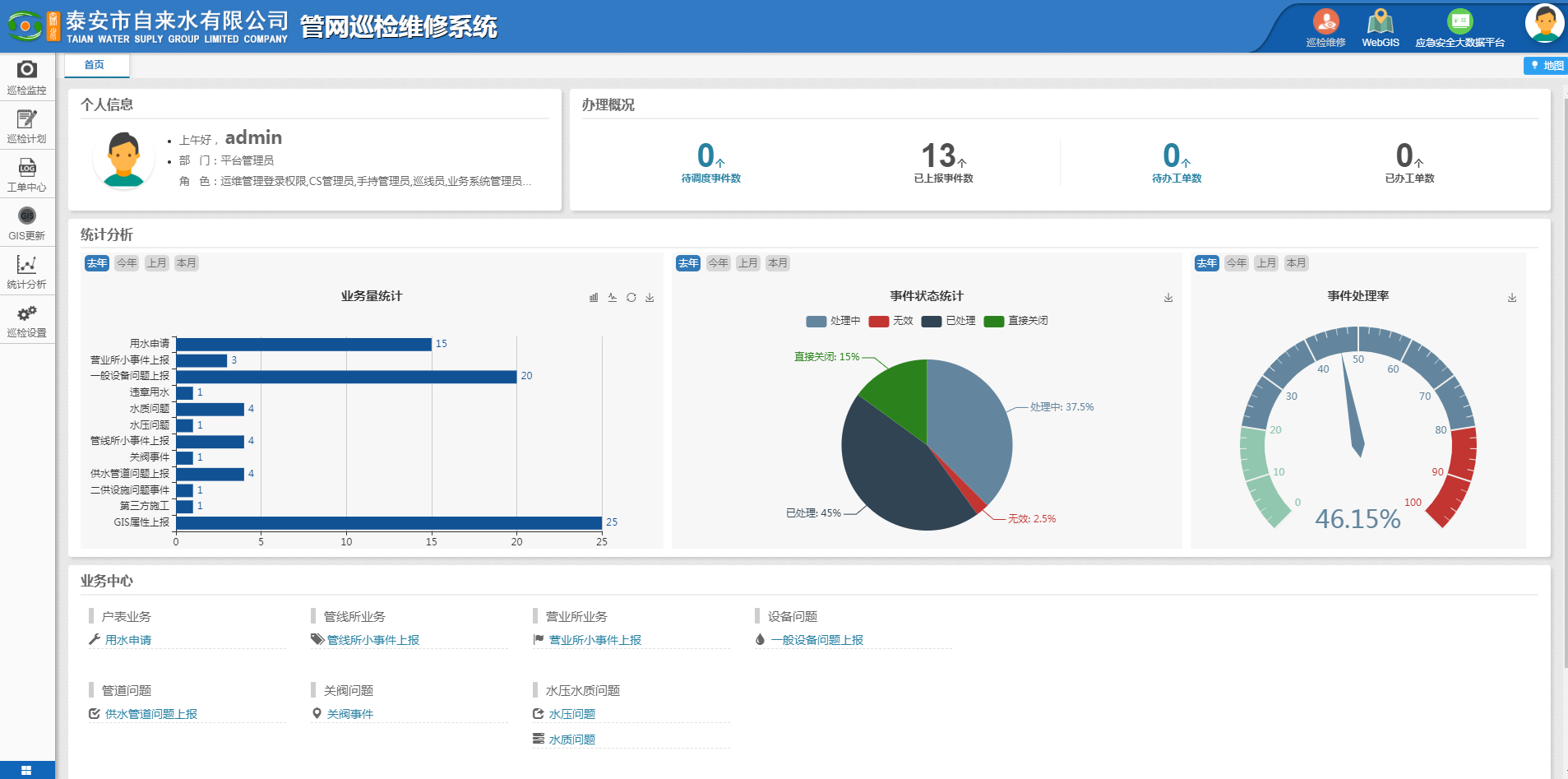 ????????公司領(lǐng)導(dǎo)組織有關(guān)部門(mén)、人員對(duì)供水GIS系統(tǒng)建設(shè)進(jìn)行了認(rèn)真細(xì)致的考察、調(diào)研,對(duì)公司業(yè)務(wù)流程梳理及系統(tǒng)接口需求進(jìn)行了溝通整理。公司供水GIS系統(tǒng)包含四大模塊,有供水管理地理信息系統(tǒng)C/S(內(nèi)網(wǎng)系統(tǒng))、供水管網(wǎng)地理信息系統(tǒng)B/S(網(wǎng)頁(yè)客戶端)、供水管網(wǎng)巡檢系統(tǒng)、供水管網(wǎng)維修系統(tǒng),四大模塊中包含數(shù)據(jù)管理、數(shù)據(jù)分析、工單系統(tǒng)、巡線管理、移動(dòng)終端監(jiān)控、運(yùn)維管理等46項(xiàng)功能。項(xiàng)目自2020年4月初正式啟動(dòng), 2020年6月中旬完成四大模塊搭建及相關(guān)功能調(diào)試。