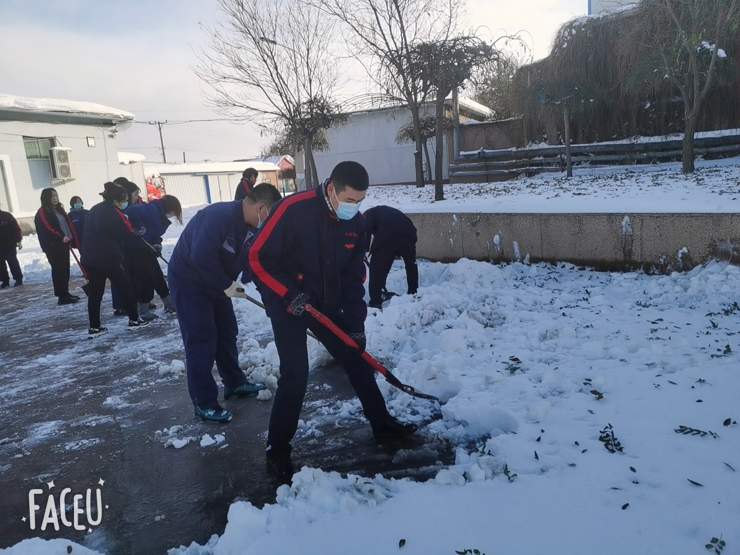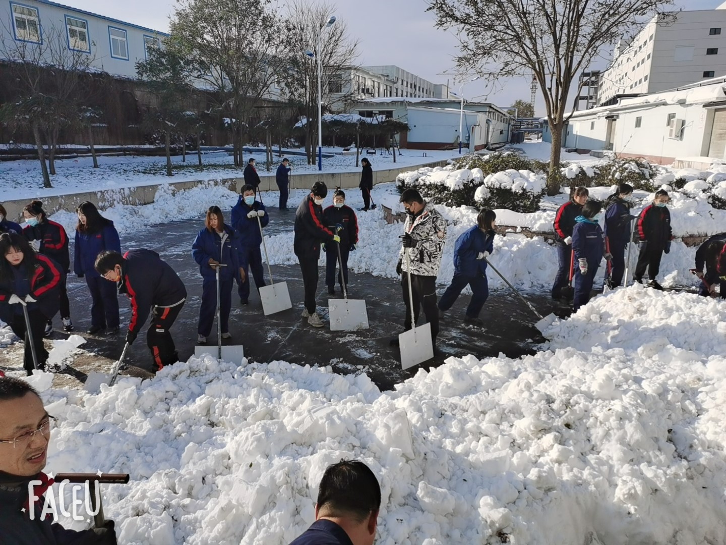 踏著厚厚的積雪,大家不畏嚴(yán)寒,積極主動(dòng),在郭總的現(xiàn)場(chǎng)指揮下全力以赴地投入到掃雪工作中。包裝中心員工在郭崇、劉斌帶領(lǐng)下和張大為帶領(lǐng)的運(yùn)輸班利用鐵鍬、笤掃等工具,不怕臟累,你鏟我掃,清理出從新樓到食堂的道路。董事長看到后,深情的問候他們一聲辛苦了。綠花班在李乃平的帶領(lǐng)下清理了辦公樓前等道路積雪。盡管大家的臉都凍得通紅通紅的,但手中的掃雪工具卻不停的揮舞著,掃雪的隊(duì)伍成了一道靚麗的風(fēng)景線,給2021的冬天增添了一份別樣的溫暖,經(jīng)過六個(gè)小時(shí)的浴“雪”奮戰(zhàn),公司通往食堂的路面積雪和院內(nèi)的大部分積雪均清理干凈。